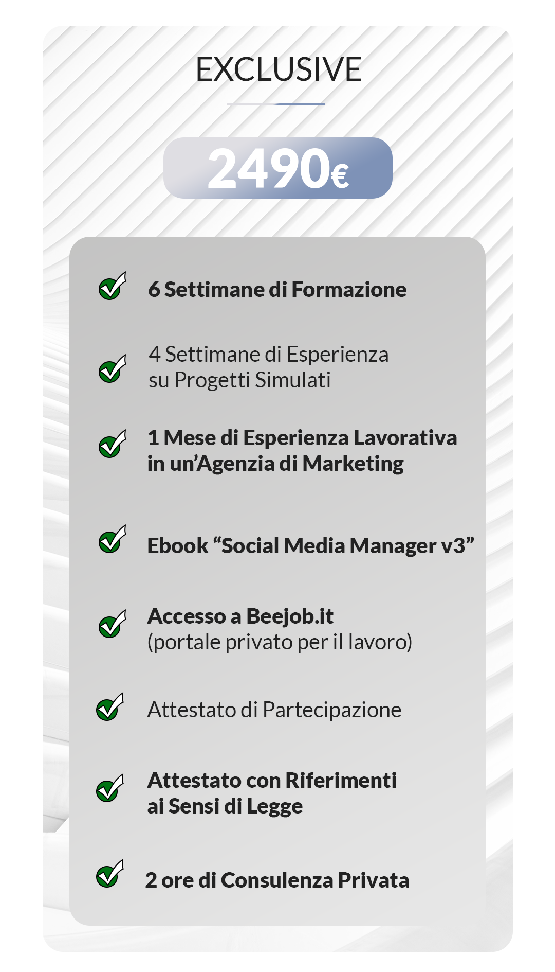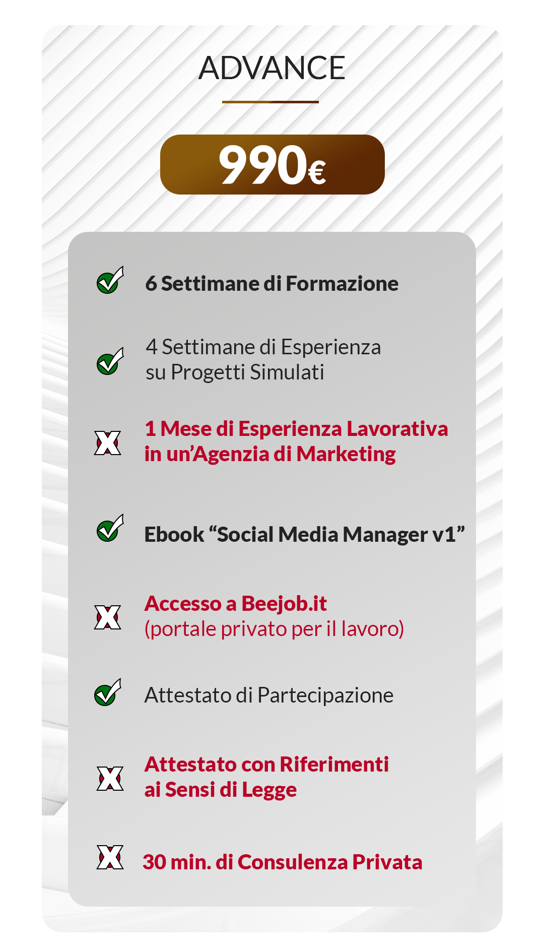 Sarai poi pronto a tutti gli effetti a diventare un Social Media Manager e lavorare in completa autonomia in modo da avere più spazio per la gestione del tuo tempo, una migliore indipendenza economica e maggiori sicurezze per costruirti un futuro in questo periodo storico incerto e precario.